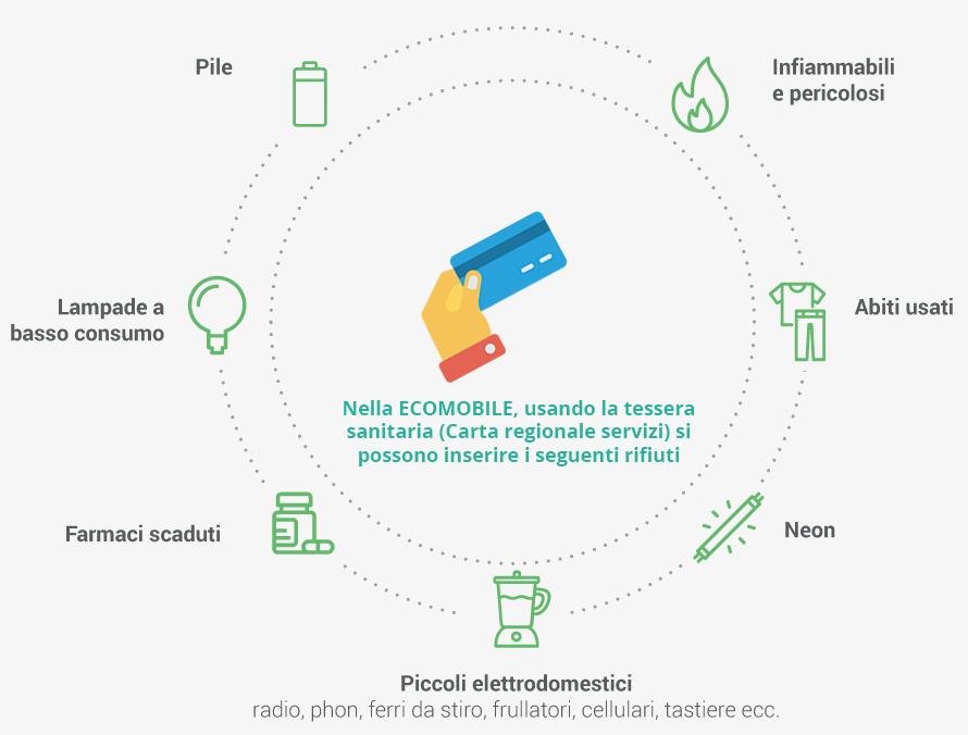 Nei quartieri arriva una nuova struttura di raccolta che permette di conferire, un giorno alla settimana, 7 particolari tipologie di rifiuti Abiti Pile Elettrodomestici Farmaci Infiammabili Lampade Neon Nella ECOMOBILE, usando la tessera sanitaria (Carta regionale servizi) si possono inserire i seguenti rifiuti